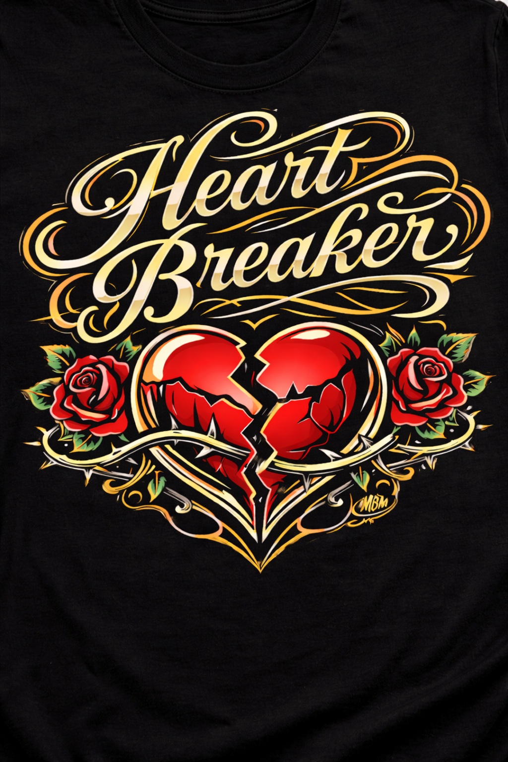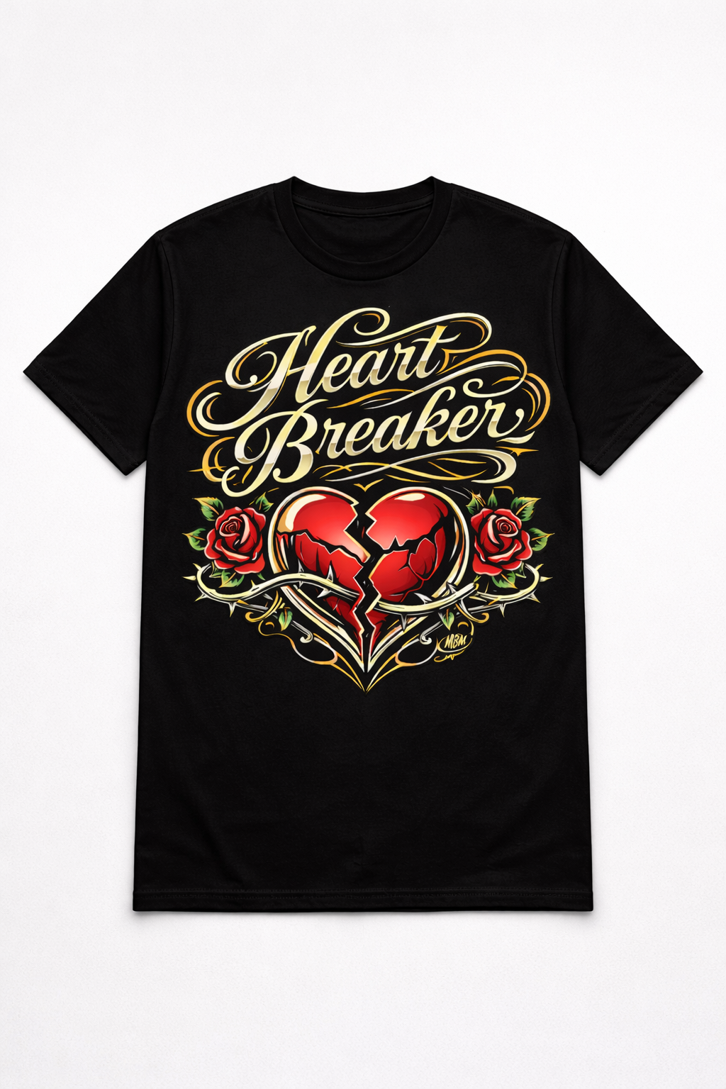 Shop the Heart Breaker Tee by Merch By Mike — West Coast streetwear with bold gold script, cracked heart artwork, and a sleeve rose hit. Available now.