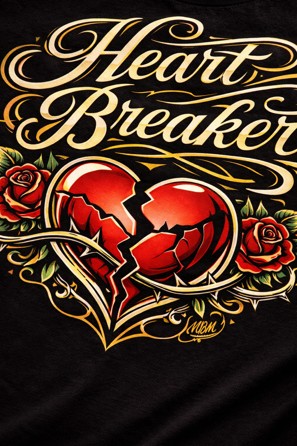 Heart Breaker brings that classic West Coast plaque-script energy with a cracked heart, barbed wire, and roses — equal parts romance and attitude. It’s bold, clean, and built to stand out on black tees with a premium DTF print that holds detail and contrast.