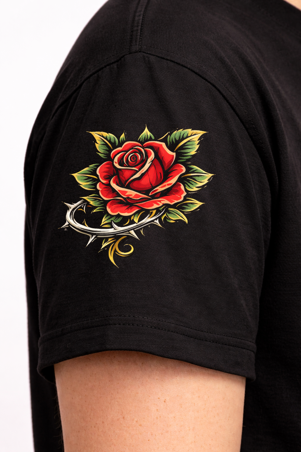 The sleeve rose hit adds a premium streetwear detail without overdoing it
