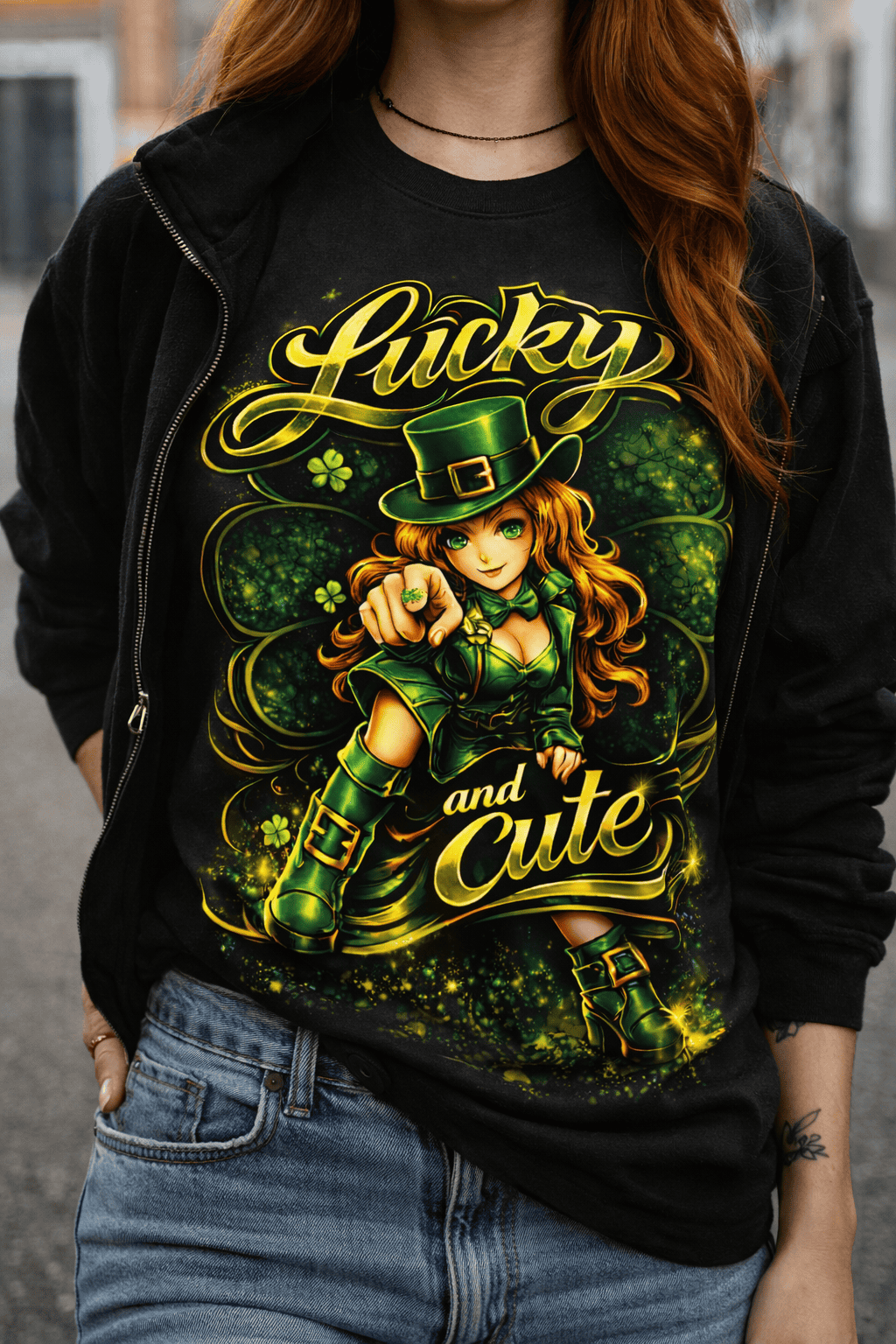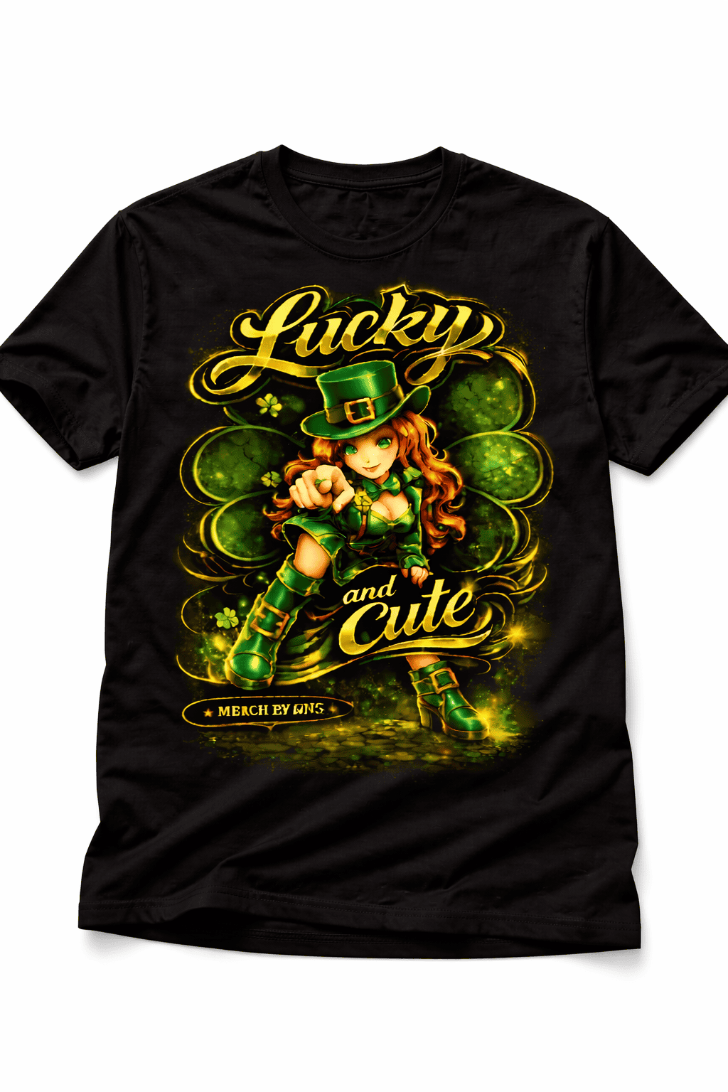 The 2025 Lucky and Cute design was built for depth, separation, and black garment punch — refined with rim lighting, layered clover depth planes, and controlled contrast compression for premium print clarity.