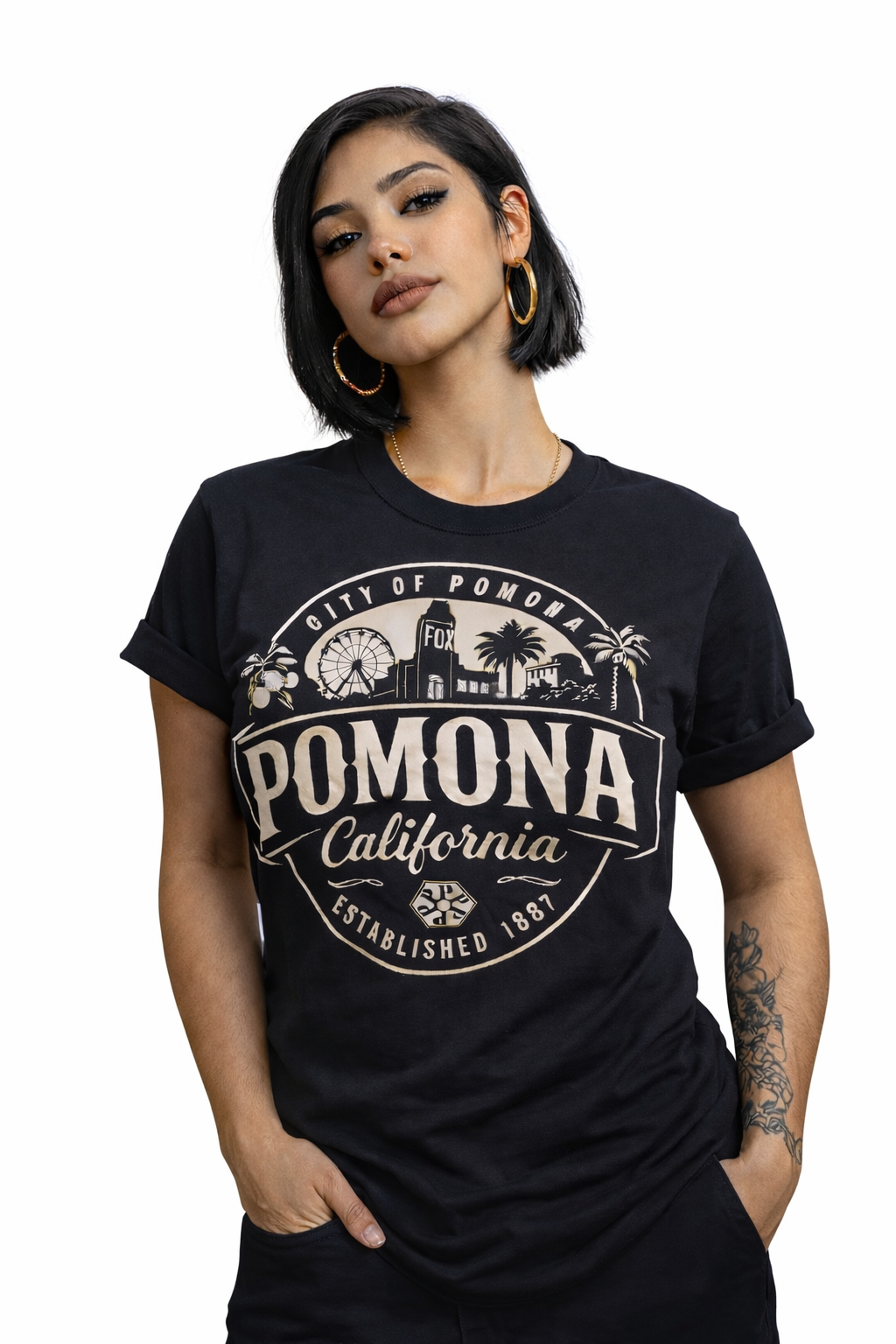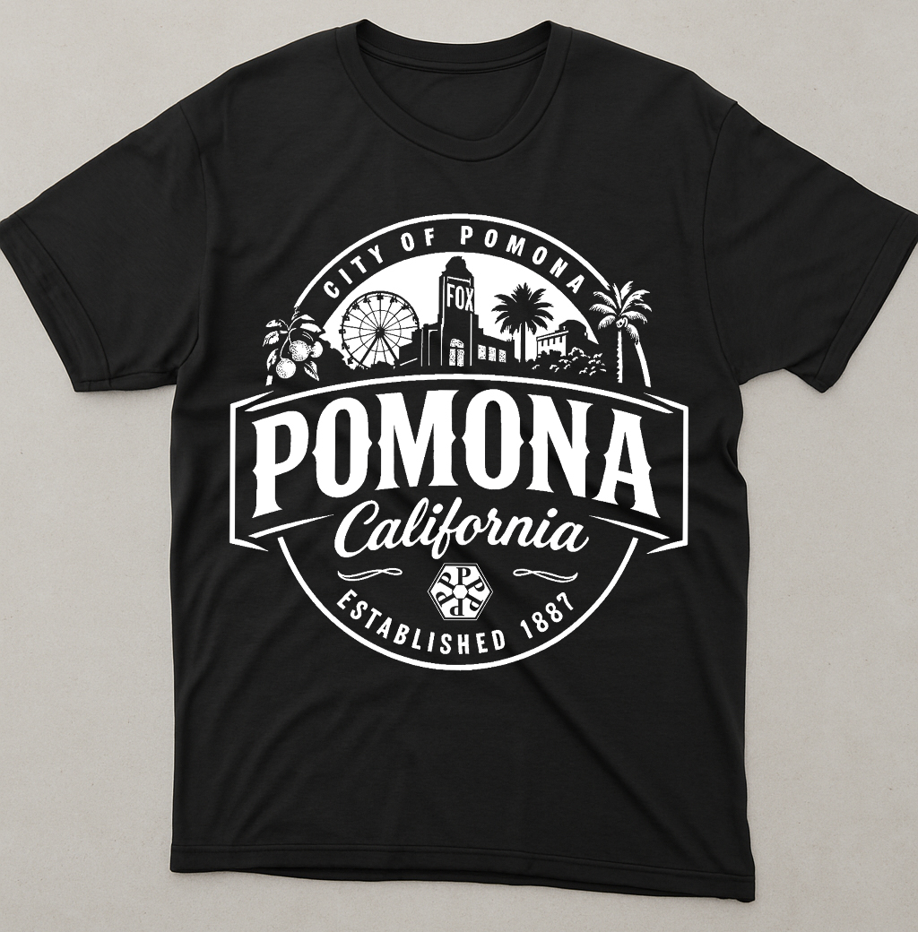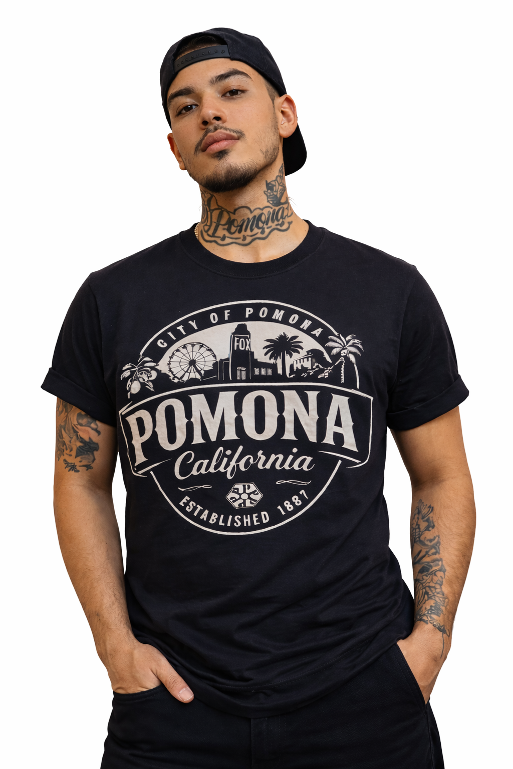 hitehis Pomona California Heritage T-Shirt is a timeless tribute to the roots of the city — from its historic landmarks to its deep SoCal culture. Designed in a clean, vintage badge style, this tee features iconic Pomona imagery including the Fox Theater, Fairplex Ferris wheel, and classic palm silhouettes, all brought together in a bold, high-contrast design made to stand out on black.